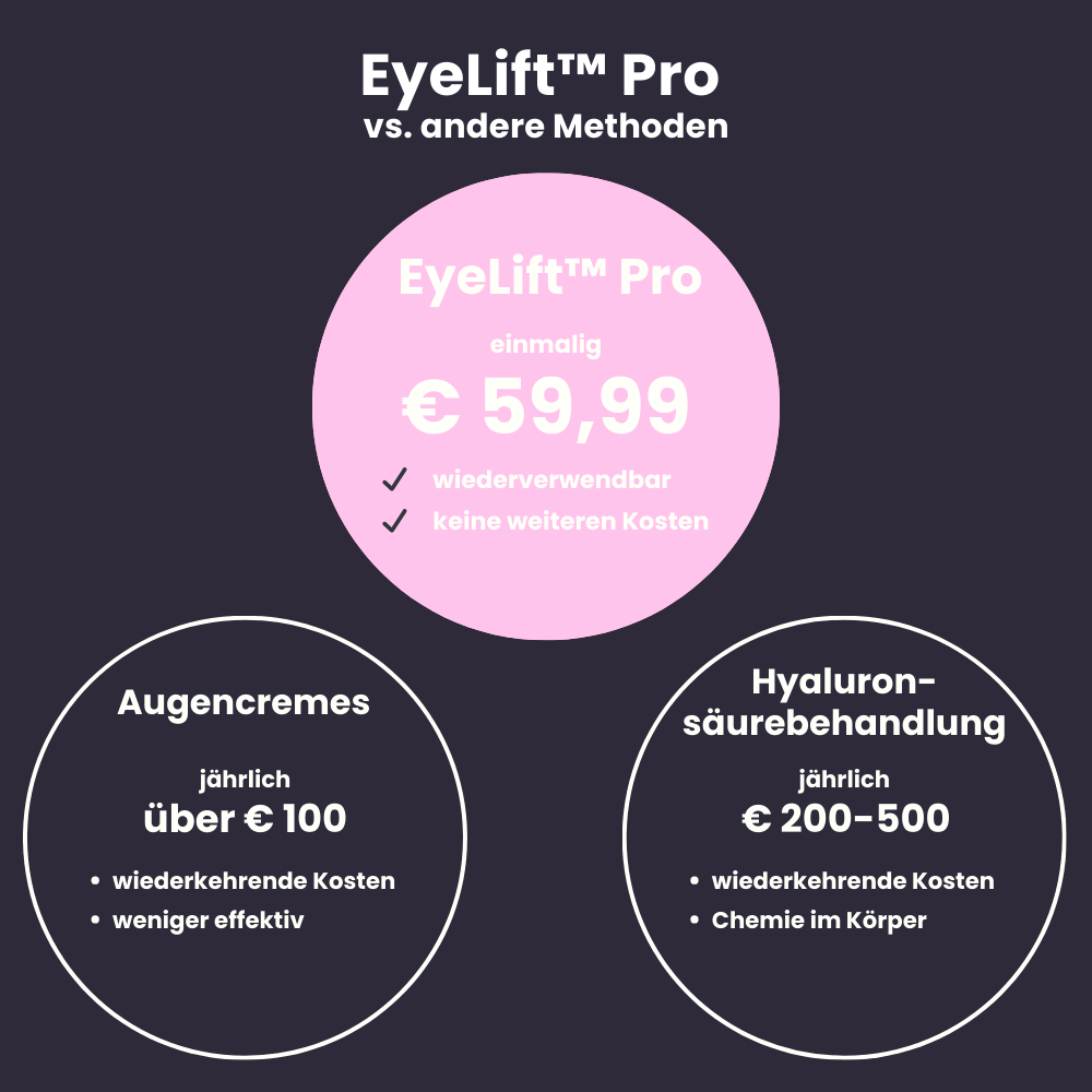 Mit dem EyeLift™ Pro werden andere Behandlungsmethoden überflüssig. Hast du dir das Gerät einmal zugelegt, musst du dir keine Gedanken mehr um andere Behandlungen machen.
